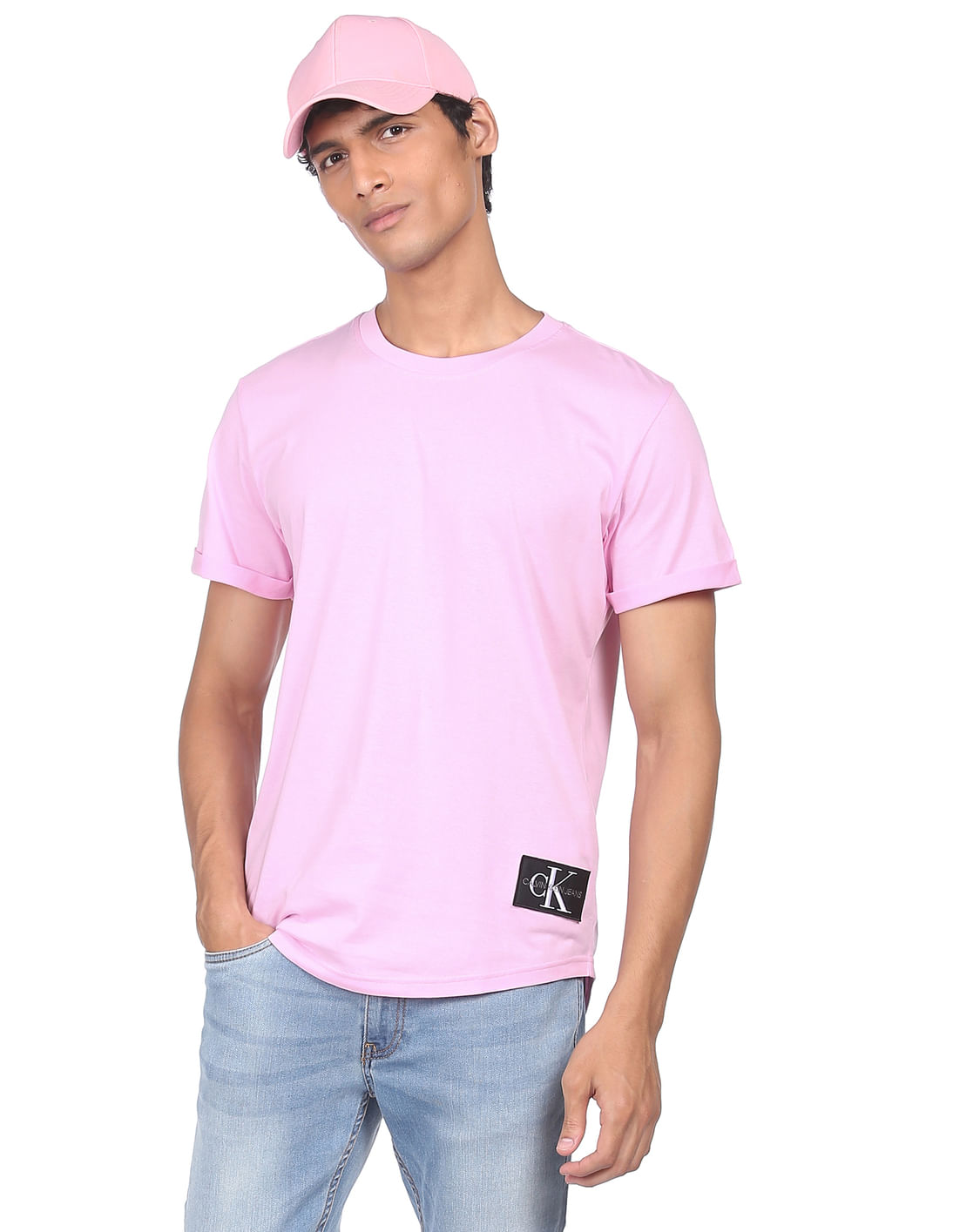 Men Pink Turned Up Sleeve Logo Badge T-Shirt