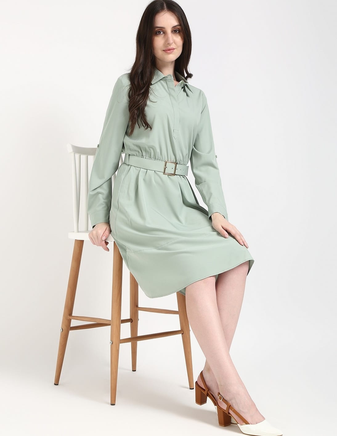 Polyester Spread Collar A-Line Dress