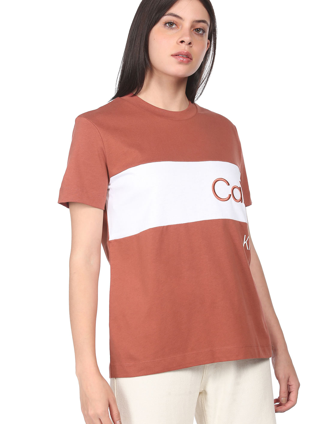 Women Brick Red Crew Neck Colour Block T-Shirt