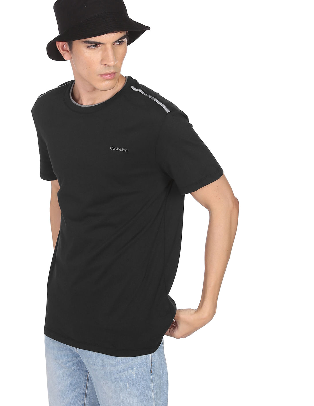 Men Black Shoulder Logo Tape Pure Cotton T-Shirt