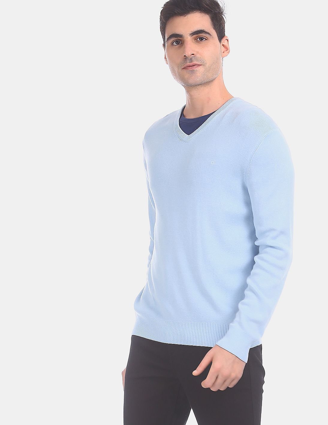 Men Light Blue V-Neck Long Sleeve Cotton Modal Sweater