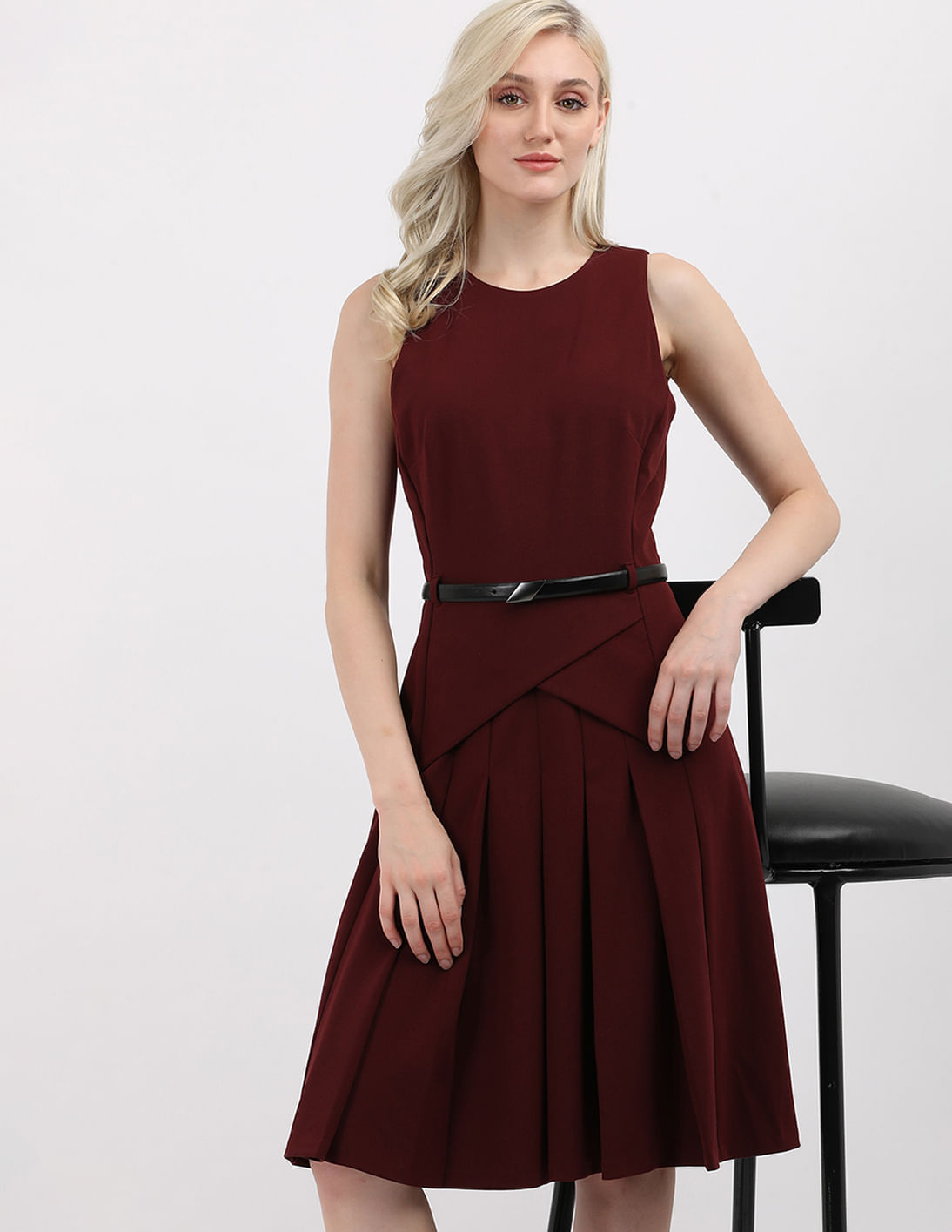 Sleeveless Front Pleat Dress With Belt