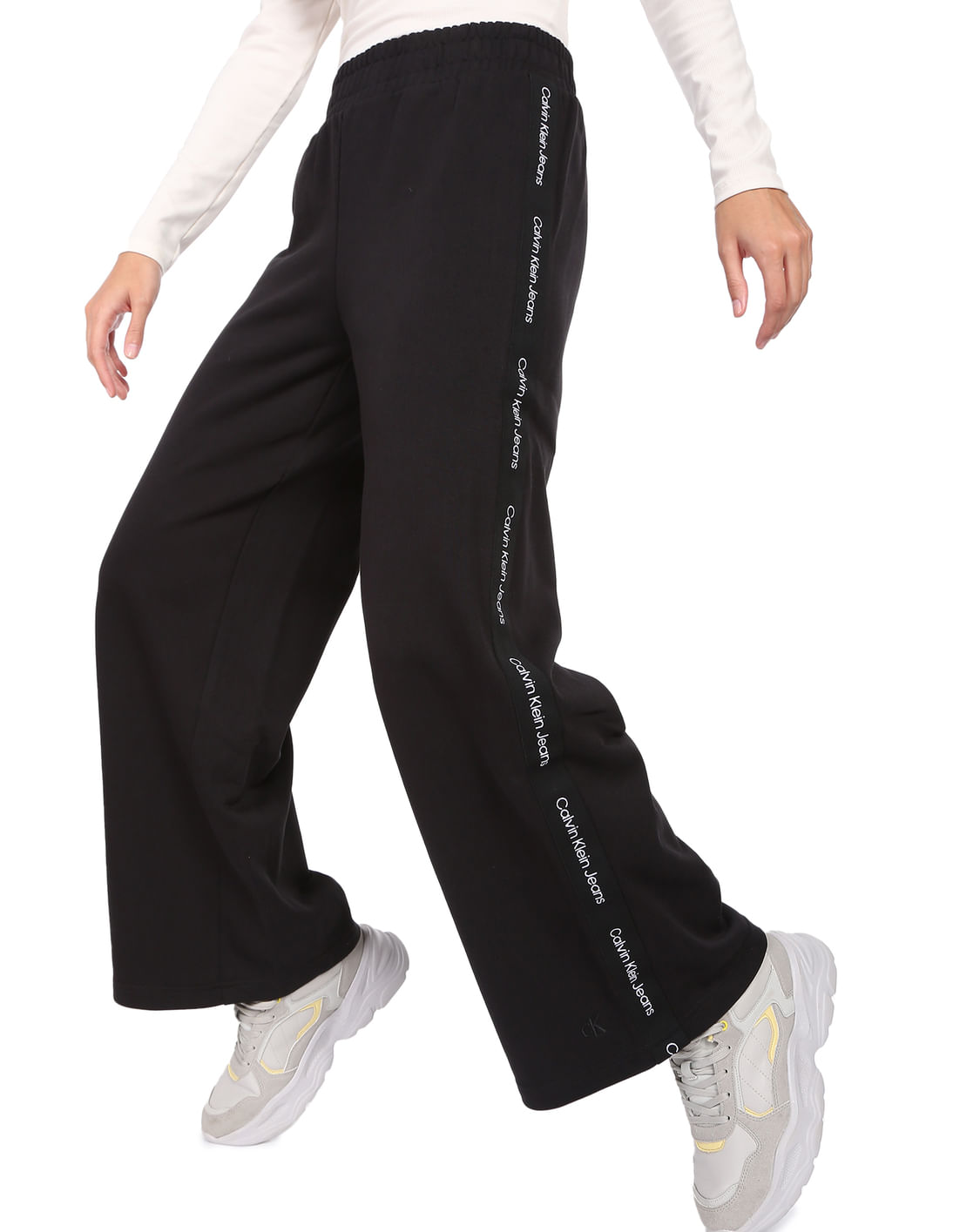 Women Black Mid Rise Brand Tape Wide Leg Track Pant