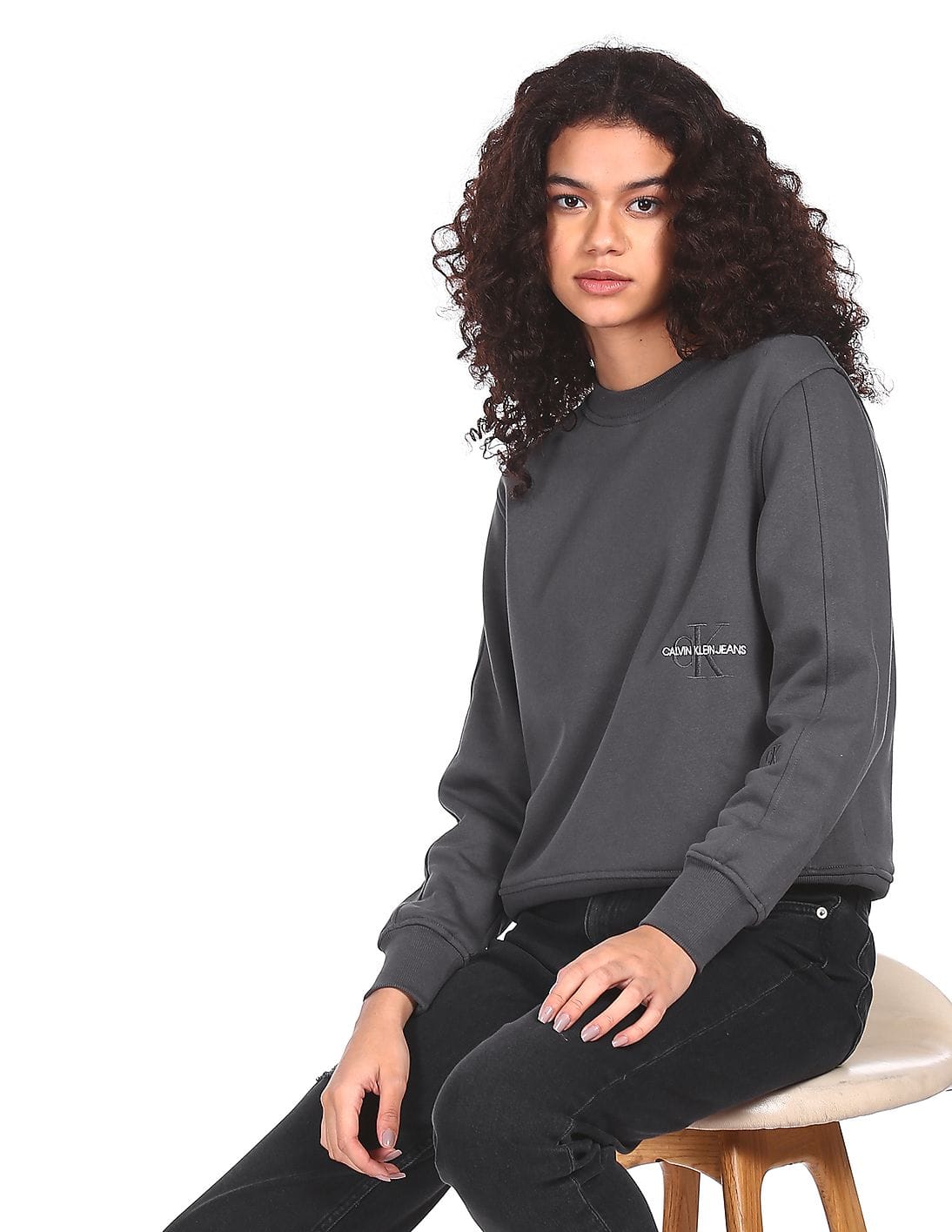 Women Grey Crew Neck Brand Embroidered Sweatshirt