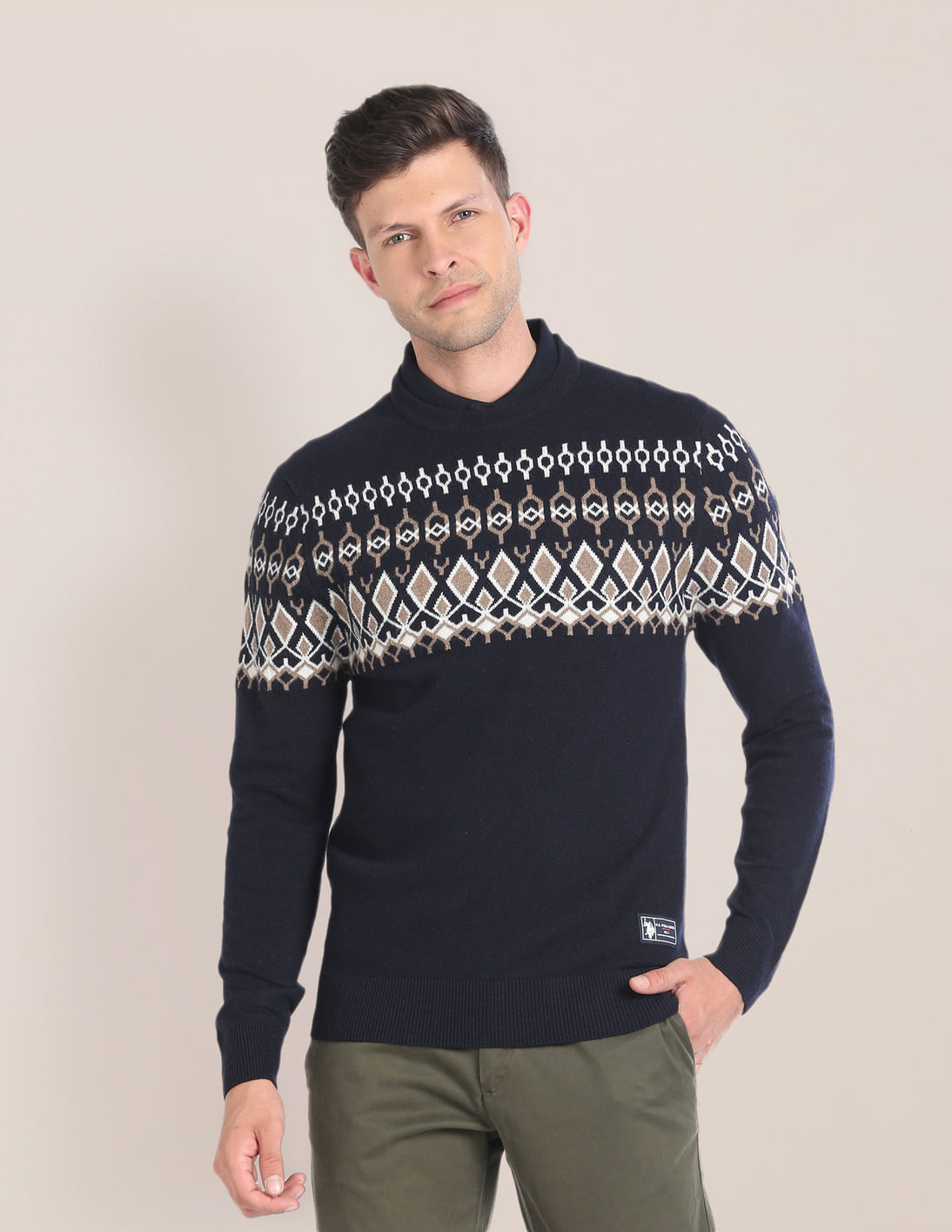 Crew Neck Patterned Knit Sweater